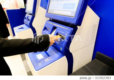 ビジネスイメージ 自動チェックイン機で搭乗手続きをするビジネスウーマン