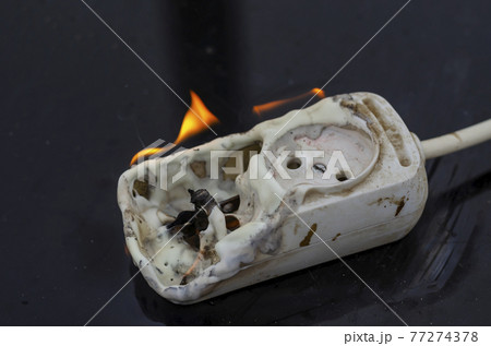 Household electrical appliance fire concept. Final stage of power strip fire due to short circuit. Complete reflow of the electrical appliance. Fire safety, visual aid.
