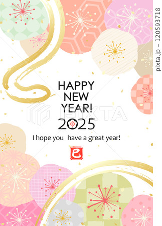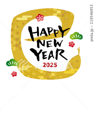 2025 巳年 かわいい年賀状はがきテンプレート 線画の縁起物のアイコン_縦