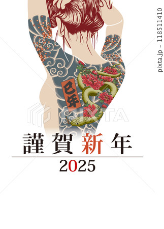 2025年賀状テンプレート「タトゥーガール」謹賀新年 手書き用スペース付パターン