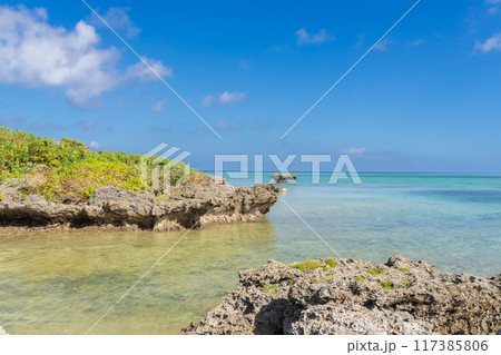 干潮時に現れる石垣島タバガーの幻想的な岩場と澄んだ海の風景