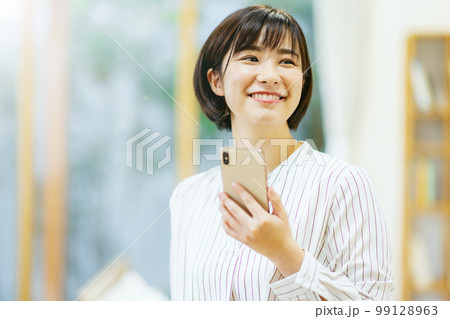 駅のロビーでスマホを使う笑顔の女性(アプリ・転職・求人・就職・ヘッドハンティング)