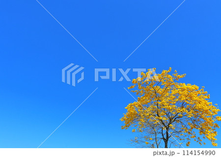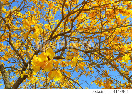 イペの木 黄色い花 青空 太陽 耕作地 道路