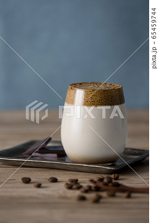 お皿とスプーン付きダルゴナコーヒー Dalgona Coffee whipped coffee
