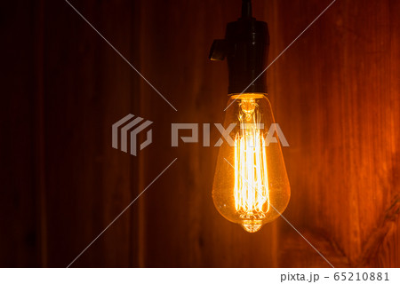 木の壁の前の点灯した白熱電球