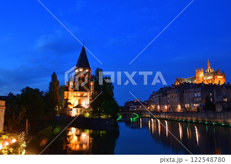 Temple Neuf and illuminated bridge in Metz, France