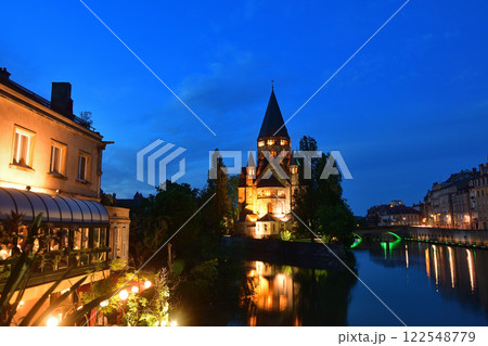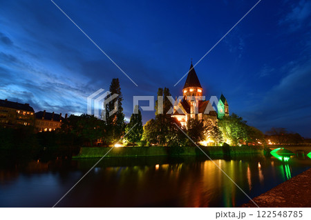 メッス、フランス。プロテスタント教会、「タンプル・ヌフ」の夜景。2024年5月11日撮影。