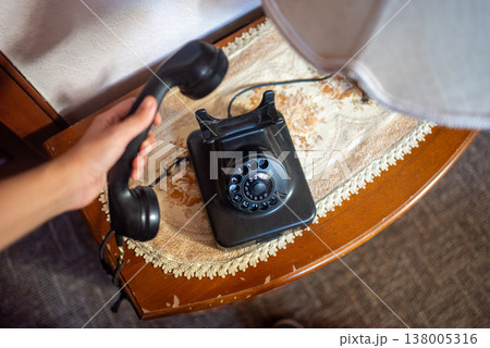 Hand Holding Vintage Rotary Telephone on Wooden Table, Nostalgic Communication Concept