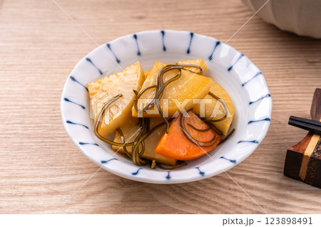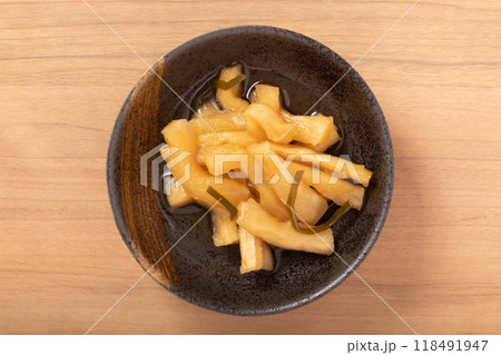 家庭菜園の収穫大根で作った、はりはり漬け。割干し。漬物。家庭料理。食べ物イメージ素材