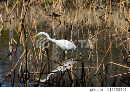 水辺で採餌するサギ科ダイサギ
