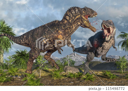 2匹のティラノサウルスが大きな口を開け獲物を探す