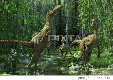 赤く高温な岩肌の大地に一匹のヴェロキラプトルが大きな口を開け鋭い牙を出しながら走っている
