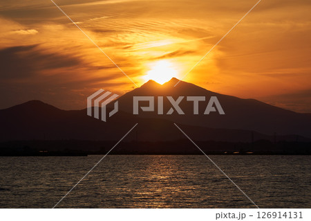 霞ヶ浦から望む夕暮れ時の筑波山と山頂に位置する太陽