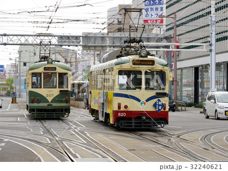 松山の路面電車 平面交差をする路面電車と郊外電車 伊予鉄道 大手町駅 松山市 愛媛県