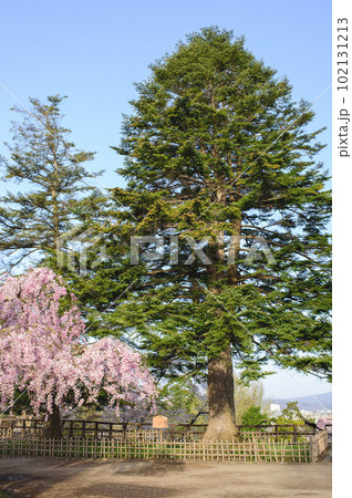 清々しい春の朝 弘前城本丸広場の樅と紅枝垂れ 青森県