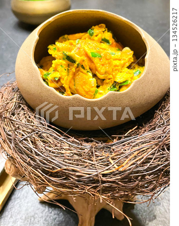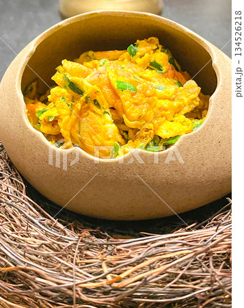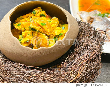 中国宴会料理・香葱炒鸵鸟蛋(ダチョウの卵炒め)