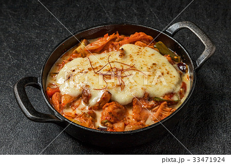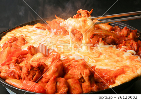 チーズタッカルビ。チーズ入り、鶏肉と野菜の韓国風炒め物。