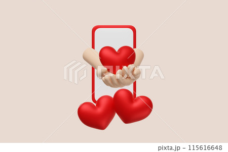 mobile phone, smartphone with hands hold red heart isolated on pink background. valentine's day, looking for a partner concept, 3d illustration render