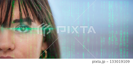 Woman, eye and biometrics on hologram for cybersecurity, futuristic profiling or identity. Portrait of female face with optical lens for future facial recognition or sight in double exposure overlay