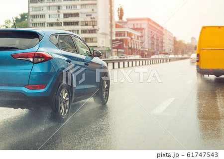 Cars moving fast by wet highway after heavy rain with warm sunset evening sun on background. Vehicles riding with high speed by rainy city street road. aquaplaning or hydroplaning effect