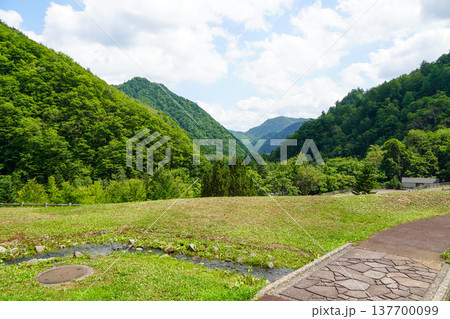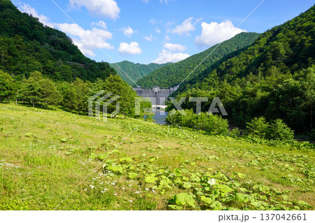 群馬県中之条町・四万川ダムから望む放流水と夏の集落風景