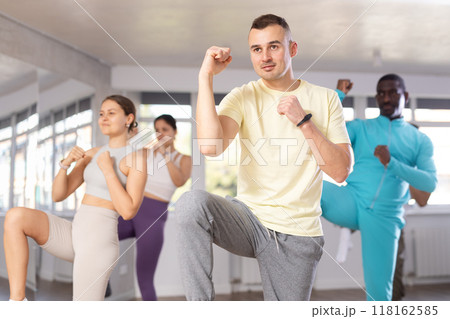 European guy with team of like-minded multinational people learn to elements of hip hop dance