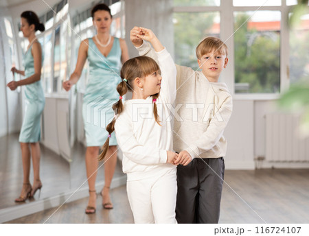 Preteen boy and girl refining slow foxtrot technique in dance hall