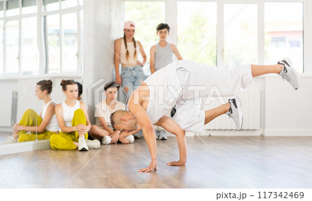 Portrait of active teen boy enjoying modern energetic dancing in group at dance studio