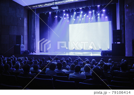 People are waiting for the speaker to speak, empty stage. Focus on the stage. blue toning photo