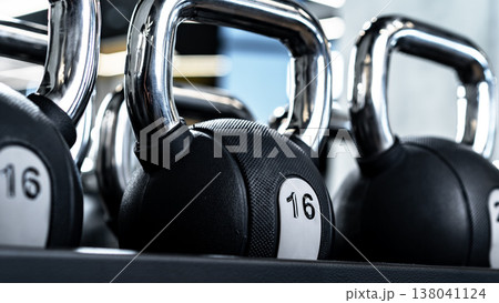 Kettlebells lined up on a rack in a fitness gym during daylight hours
