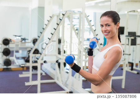 Fit woman in sportswear smiling while lifting dumbbell in weight room with rack of black dumbbells