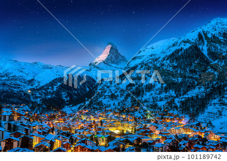 Matterhorn and swiss alps in Zermatt, Switzerland. Matterhorn at night.