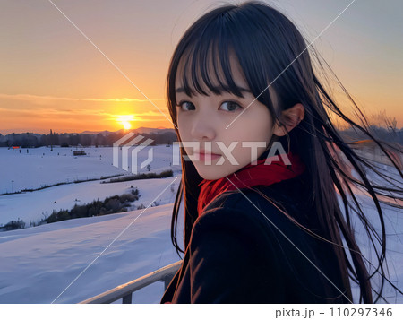 AI画像 雪景色の夕暮れに寂しそうに見つめる若い女性