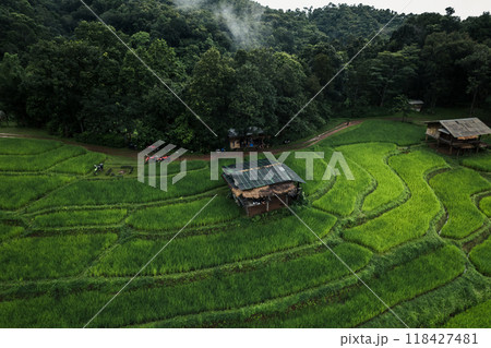 Aerial view of the rice fields,Rice fields and mountains in the early morning