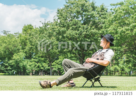 公園・キャンプ場・芝生でチェアリングするアウトドアファッションのアジア人男性