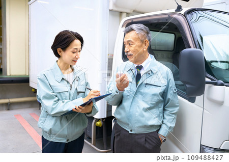 トラックの前でアルコール検査するドライバー