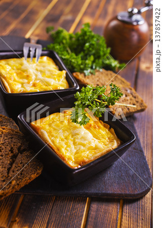 Roasted mushrooms, chicken and cheese gratin in pan, on wooden background