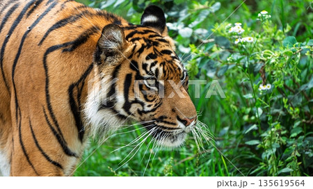 Majestic Sumatran Tiger Prowling Through Lush Greenery Habitat at National Park, Safari