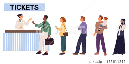 People standing in line. Men and women at queue to cashier. Public transport ticket office pay counter. Customers buying passes for movie or theater. Waiting for payment. Vector concept