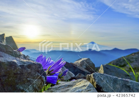 朝日とチシマギキョウ(八ヶ岳赤岳山頂)