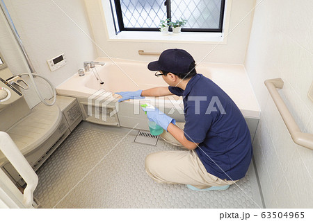 駐車場の掃き掃除をするハウスクリーニング の女性