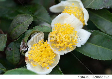 White flower of Camellia sinensis tea plant with yellow stamens among green leaves in natural light creating fresh botanical background