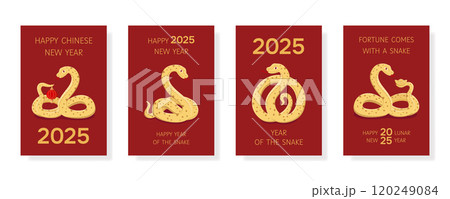 New Year 2025 cards set in red and gold colors. Chinese zodiac Snake symbol of the year. Lunar New Year concept. Template of cover,card,poster,flyer, banner. Vector illustration with snakes