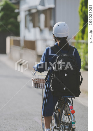 自転車通学する女子高校生 後ろ姿 住宅地 市街地