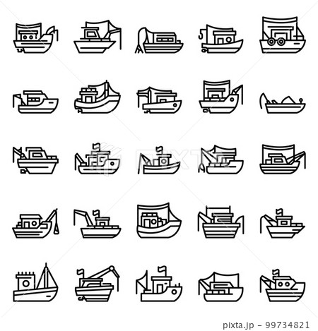 Fishing boat icons set. Outline set of fishing boat vector icons for web design isolated on white background
