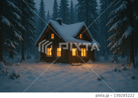 Cozy wooden cabin illuminated with warm lights in a snowy forest at night surrounded by tall evergreen trees