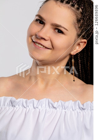 A Stylish Young Woman with Beautifully Braided Hair Dressed in a Trendy OffShoulder Top