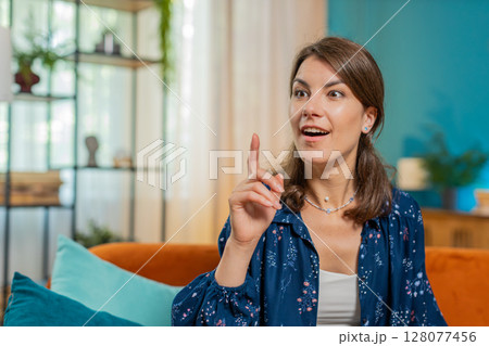 Thoughtful inspired woman make gesture raises finger came up creative plan feels excited good idea