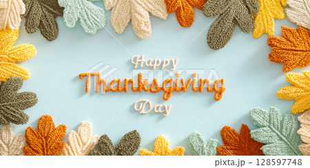 Knitted Autumn Leaves Framing Happy Thanksgiving Text On Soft Blue Background In Top View. Concept Of DIY, Cozy Holiday Greeting, Handmade Seasonal Decor, And Wholesome Visuals For Fall Celebrations
