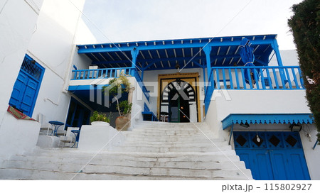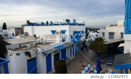 シディ・ブ・サイド (チュニジア) の町と青い海